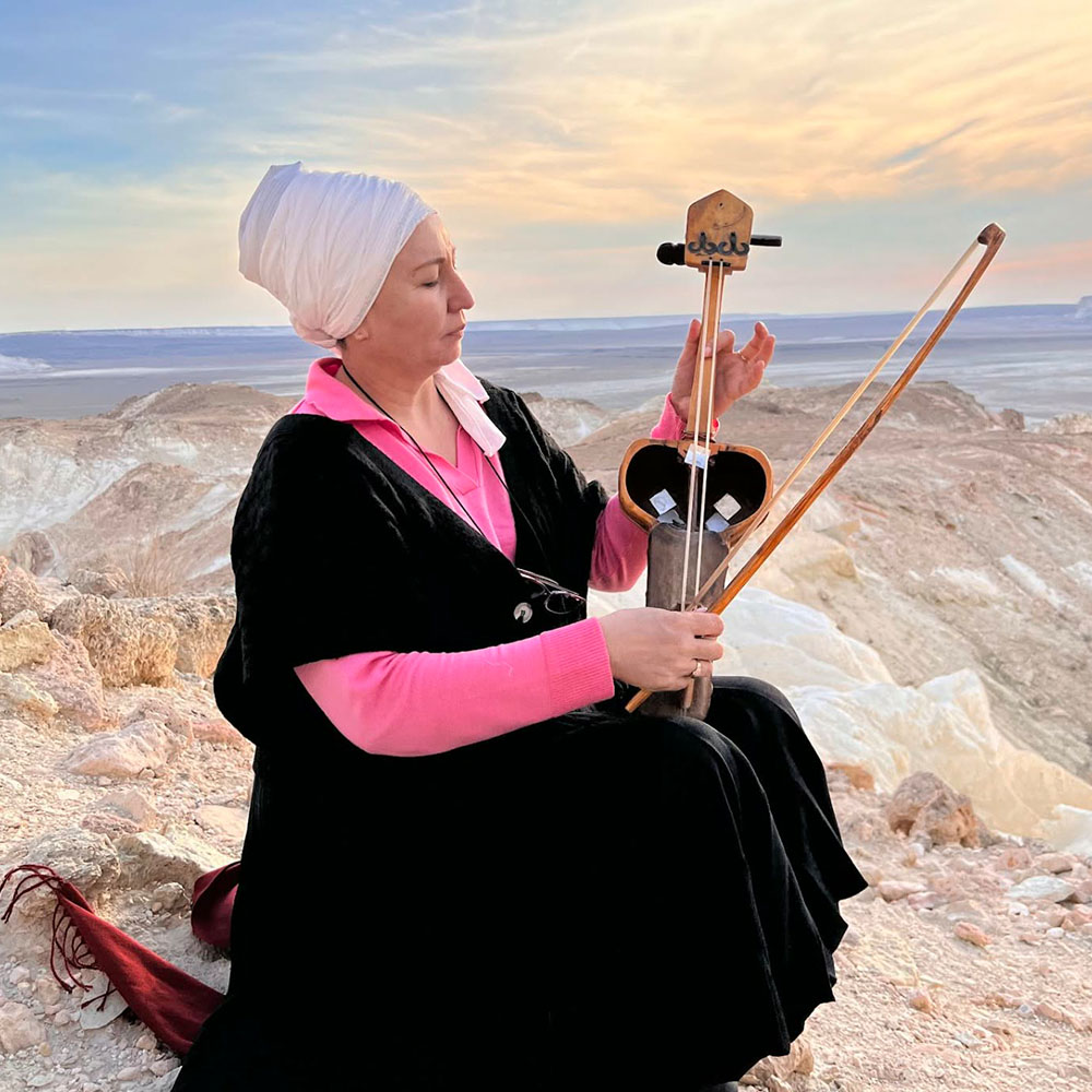 Naming it the Sonic Arts Triennale after Korkut is a way of asking for an aq bata — a blessing. Both a mythical and a historical figure, Korkut Ata (or Qorqyt Ata) was an improviser who, more than a thousand years ago, is said to have built the qobyz — a powerful musical instrument capable of healing and warding off evil spirits, even death itself. Today, a giant qobyz sounds on the banks of the Syr Darya River near his birthplace. Built in 1980 by architect Bek Ibrayev and acoustical engineer Sovet Isatayev, the eight-metre-tall monument harnesses the steppe wind to play an organ housed within. Its forty metal pipes howl and moan as the wind passes through, singing eternally to the land — thus, healing it.