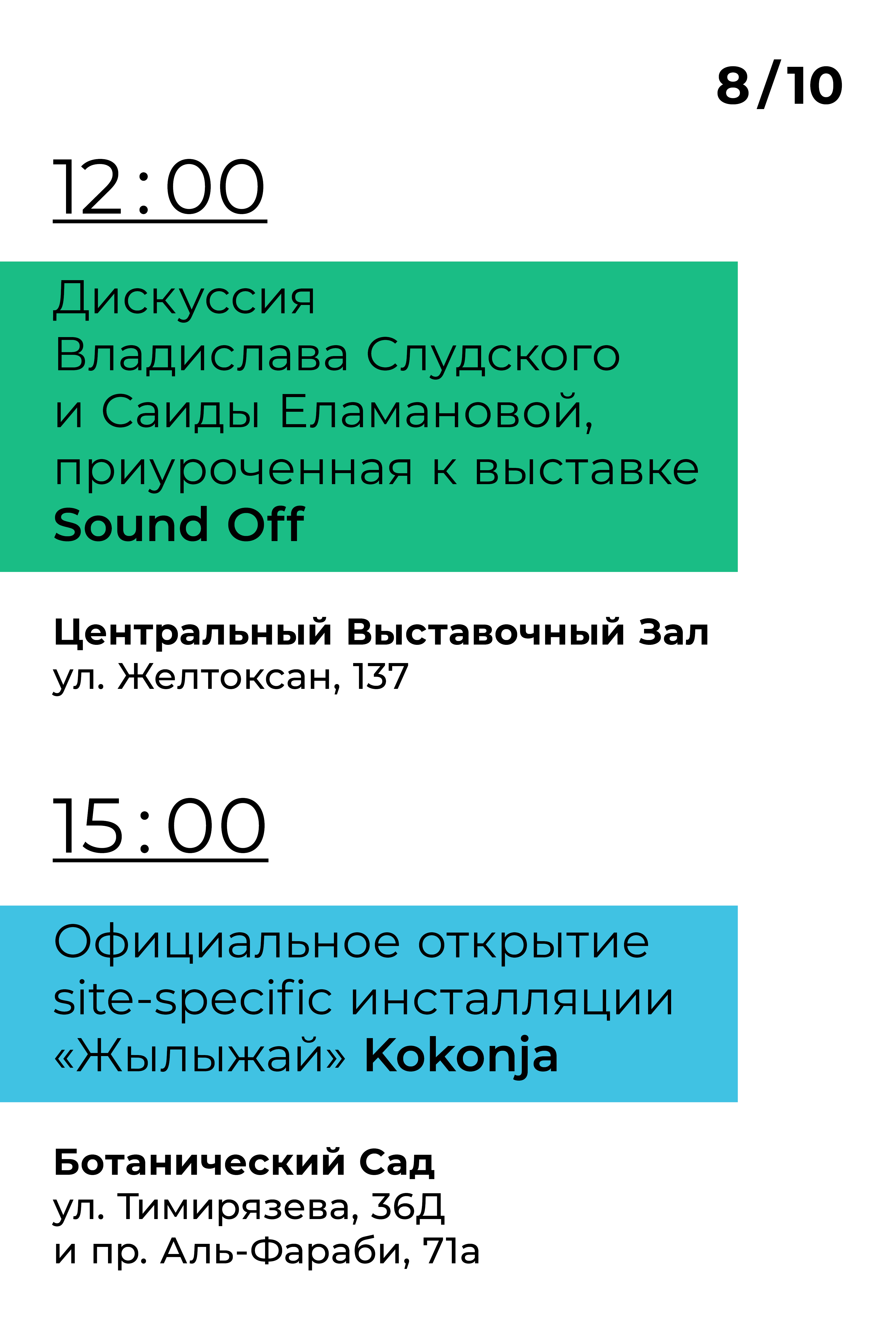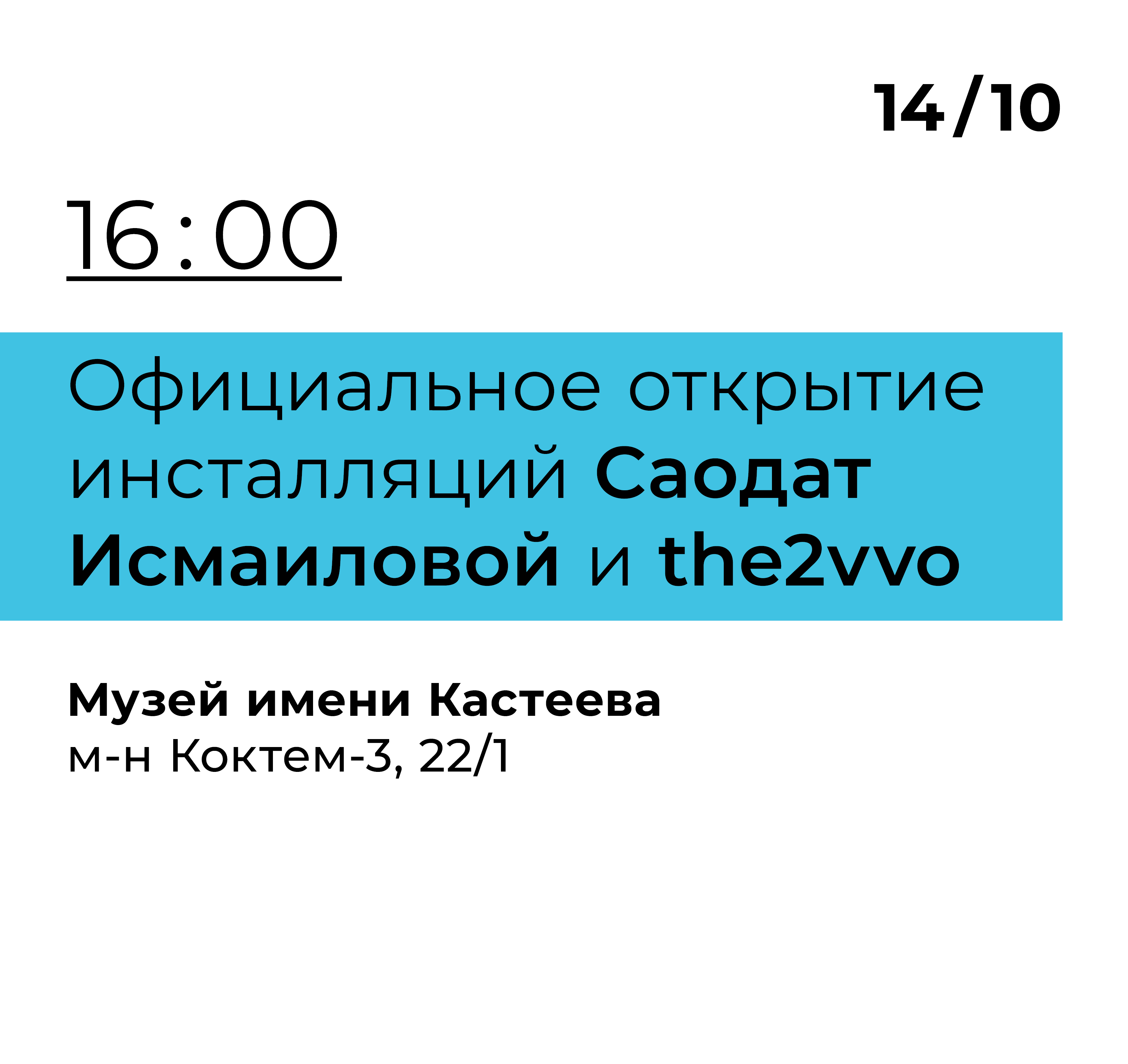инстаграме. Билеты на выставку Sound Off и входной билет в Музей им. Кастеева, где расположена инсталляция the2vvo, можно купить офлайн в кассах музеев. Посетить site-specific инсталляцию «Жылыжай» можно по входному билету в Ботанический сад — билеты
